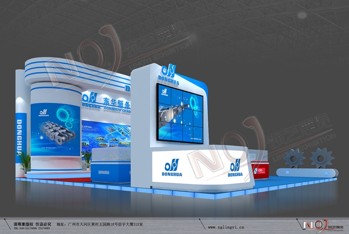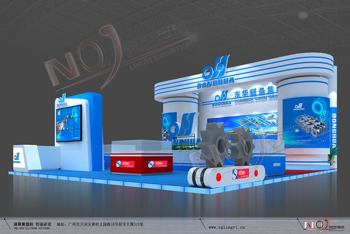 契合東華鏈條的品牌形象和產品特性,采用矩形結構,再搭配燈具燈光的效果,襯托出展位高端、時尚的氛圍,突出一種現代、大氣的時尚品味。