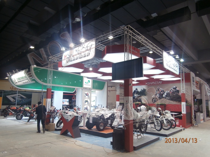契合鑫源摩托的品牌形象和產品特性,采用矩形結構,再搭配燈具燈光的效果,襯托出展位簡約、時尚的氛圍,突出一種現代、簡約的時尚品味。